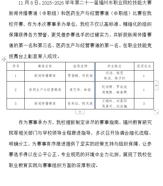实力绽放,“金“彩纷呈!长乐职专在第21届新闻传播赛道和医药生产与经营赛道包揽双金,再添一银
