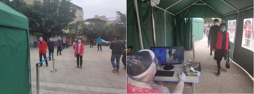 演练人员模拟师生入校,由学校保安和保卫组值班教师安排学生有序进入红外线体温监测通道,人与人之间保持1米距离。监测人员在仪器前观测每位师生体温情况,如发现异常情况立即启动应急程序:由值班教师将学生护送到隔离室,避免与其他人员近距离接触并做好学生心理疏导,同时通知值班行政到场进行二次检测;如二次检测结果发现体温仍然异常,询问 14 天内无疫情重点地区旅居史、途经史或确诊、疑似病例接触史;值班行政立即通知该生班主任联系学生家长到校,劝返该生,要求其及时就医,做好学生病情跟踪记录;同时,值班行政向郑德煌校长汇报并登记相关情况。