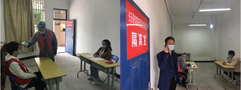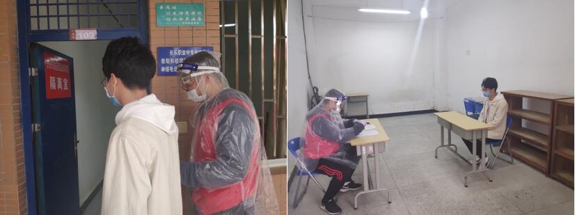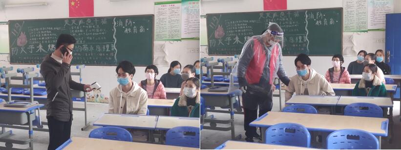 演练人员模拟了班级上课期间学生有体温异常的情况,由授课教师第一时间用额温枪对该生进行体温测量,确认其体温异常则立即通知班主任和辅导员护送该生前往隔离室,同时通知科长在隔离室等候。