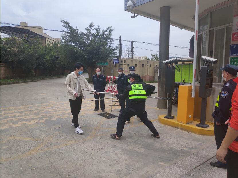演练人员模拟了突遇外来人员体温异常且拒不配合硬闯学校的情况,由学校门卫保安立即启动应急程序,阻止该人员靠近校门或进入校园,并在必要时报警,学校进入全面应急状态,立即实施应急救援行动。