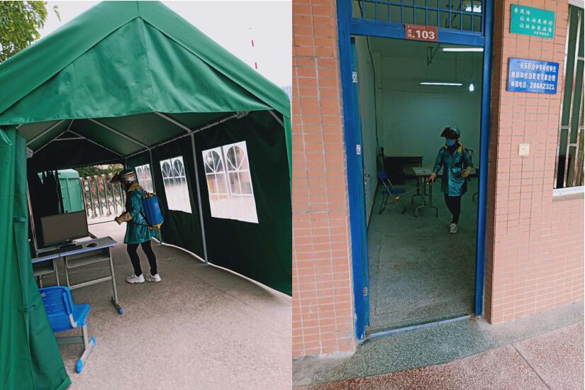 演练人员模拟了日常及重点区域的消杀流程,每日由总务处安排物业人员到学校防控物资保管室领取消杀物资,做好自我防护,对各教室和宿舍,以及各楼层走廊、楼梯、接水处、卫生间进行日常消杀工作;如遇特殊情况,则安排物业人员到校园内指定地点按程序进行消杀处理,并做好登记工作。